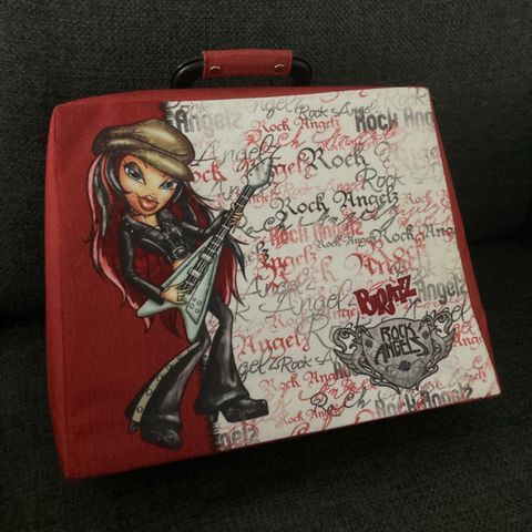Bratz skuldertaske lavet i denim med pinke kanter og skulderrem. Tasken har en stor flap med Bratz-logo og illustrationer på forsiden. Indvendigt er der et stort rum plus flere lommer og rum til opbevaring.