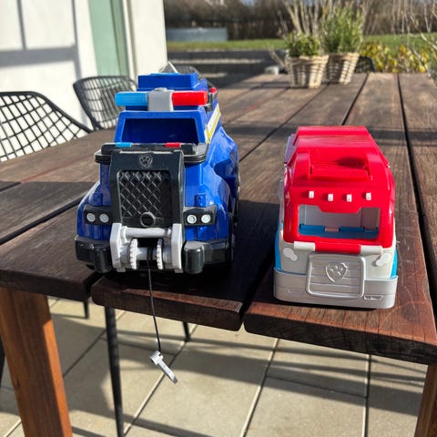 Paw Patrol lastbil med helikopter og sidevogne som kommer ud når man aktiverer dem. Også blinklys med sirene lyde.