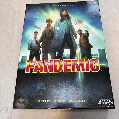 Z-Man Pandemic brætspil med spilbræt, spillekort, spillebrikker og instruktioner. Spillet går ud på at samarbejde om at stoppe globale sygdomsudbrud. Indeholder forskellige karakterer og sygdomsmarkører.