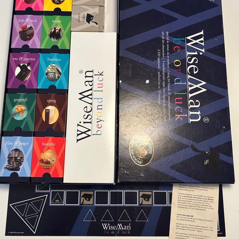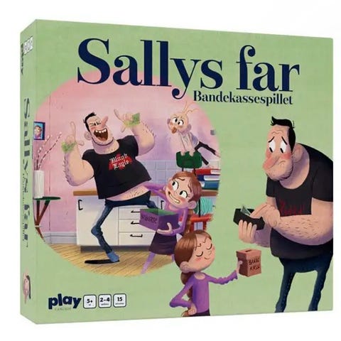 Sallys Far Bandekassespil brætspil med spilleplade, spillebrikker og terning. Spillet er designet til flere spillere og egner sig til familiespil og sociale sammenkomster.