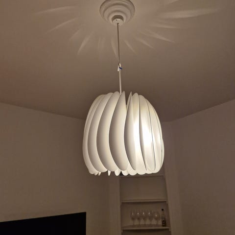 Lampen har et prisbelønnet design og er delvist fremstillet af genanvendt plast. Den kurvede turbineform spreder et behageligt lys – og skaber opmærksomhed, uanset hvor du vælger at hænge den.