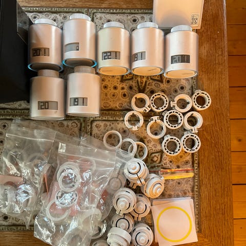 Tado Smart Radiator Termostat i hvid farve med digital temperaturvisning. Designet til at styre radiatorer og justere rumtemperaturen præcist. Inkluderer flere termostater og en tilslutningsenhed for smart hjem-integration.