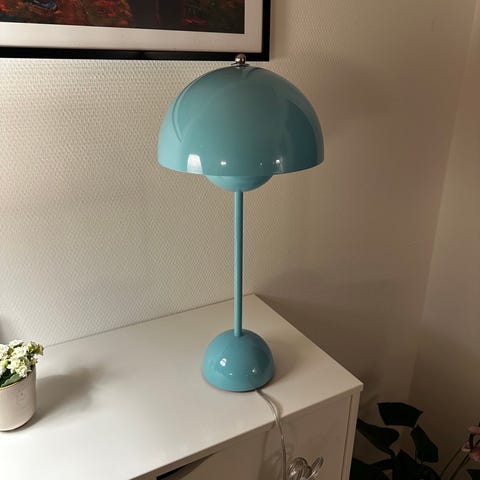 &Tradition Verner Panton bordlampe i blå farve. Lampen har en rund skærm og fod, og er designet af Verner Panton. Velegnet til brug som dekorativ bordlampe i forskellige rum.