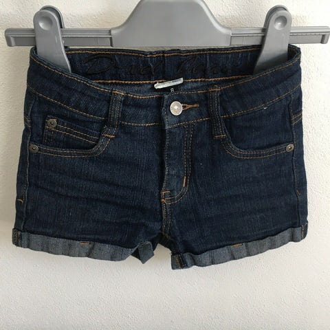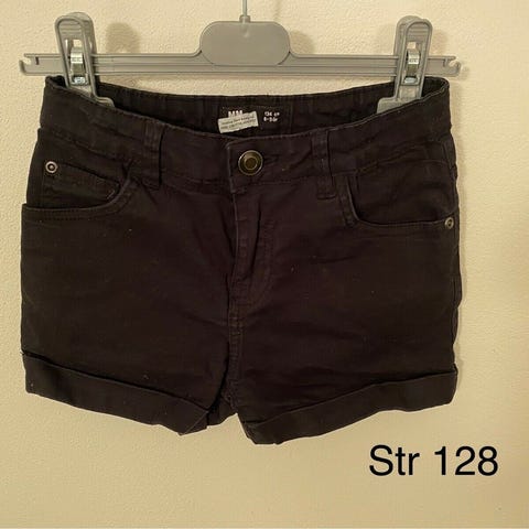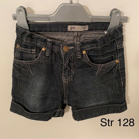 Shorts, Sort denim med strech, MM Junior, str. 128, Brugt men fremtræder pæne, 98% bomuld/2% elastan, kan justeres i taljen, der står str 134 8-9 år i shortsene - synes de svarer til en str 128