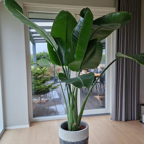 Fin Strelitzia i potte med store grønne blade. Købt i Plantorama. Flere nye skud på vej.