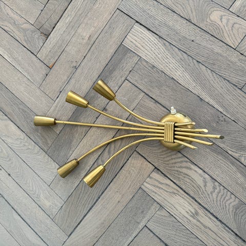 Se lige dette smukke sæt med 2 stk. væglampe i messing med cremefarvet akryl bagplade med vægbeslag og den klassiske sorte (sputnik / Art Deco lignende) fatning.