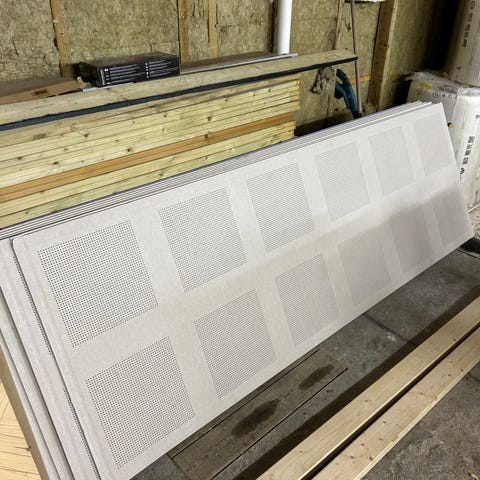 25 m2 Gyptone Line 4 akustikloftplader med dimensionerne 600x600 mm og en tykkelse på 12,5 mm. Pladerne er designet til brug i akustiske lofter og produceret af Gyproc DK.