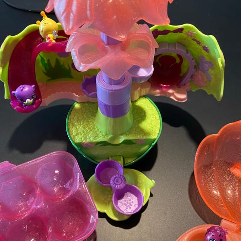 Hatchimals Hatchtopia playsets og figurer i forskellige farver og designs. Sættet indeholder flere små figurer og tilbehør, herunder blomster- og træinspirerede elementer i lyserøde, grønne og lilla nuancer.