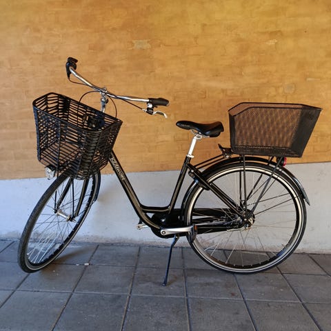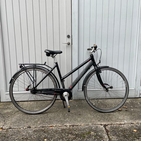 Sort Kildemoes damecykel med 7 gear, kurv og fastmonterede lygter.