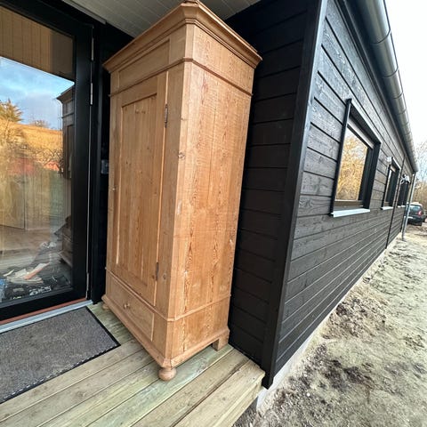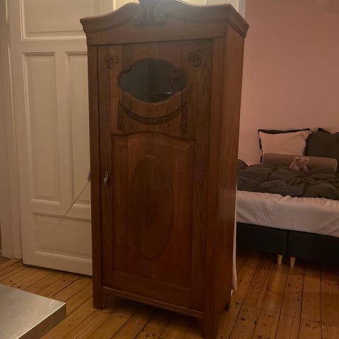 Gammel solidt træskab med lille rude. Bøjlestang og plads til hylder. Står smukt trods lidt skrammer som fremgår på billederne. Det kommer desværre ikke til sin ret hos mig længere derfor håber jeg nogle andre kan få glæde af det:)