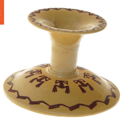 Fin lysestage med blomster mønster og guldkant, som leder tankerne hen på B&Gs Liselund stel, hvilket det ikke er.,... Stempel i bunden ( se sidste foto) brugtes som bevis på at lysestagen er porteret som blank vare (lys bund) og derefter "dekoreret i Danmark". Det man kan kalde "ikke -fabriks-objekt"