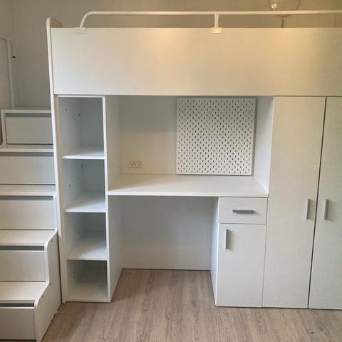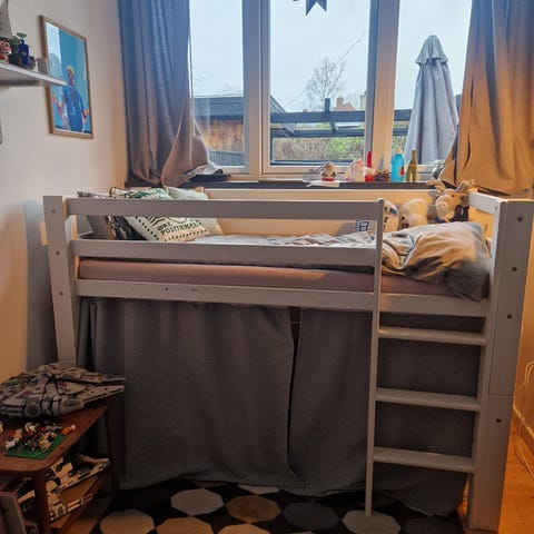 Halvhøj seng bygget på Ikea kommoder. Masser af plads til tøj og/eller legetøj. Ydermål: længde 184cm x bredde 99 cm. Madras måler: 180 cm x 90 cm. Madras medfølger. Hvis I ønsker kan skrivebord følge med i prisen gratis. Det er malet i samme farve som træværket på sengen. Bygget på MDF 18 mm.