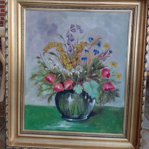 Sødt blomstermaleri. Proff. nyindrammet og opstrammet. 72,5 x 62,5 cm
