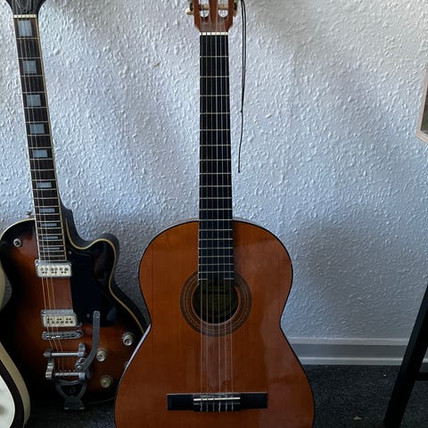 Fin klassisk guitar fra Santana, model 1570 – Made in Japan. Den er formentlig fra 1973, da der er et serienummer på neckblocken. Guitaren er bygget med grandæk og sider/ryg i, hvad der formentlig er mahogni, der giver en klar og fin klang.