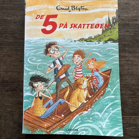 Enid Blyton De 5 På Skatteøen bog med illustrationer på forsiden. Bogen er en del af De 5-serien og indeholder et eventyr med børnene på skatteøen.