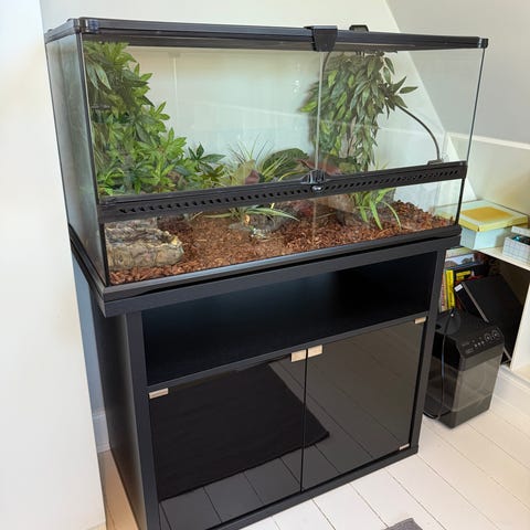 Der medfølger varmeplade, planter, skjul og solid vandskål.