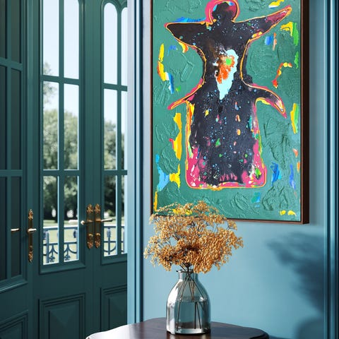 Abstrakt maleri med levende farver og unikt motiv. Velegnet til vægdekoration i hjem eller kontor. Kan tilføre et kunstnerisk præg til forskellige rum.