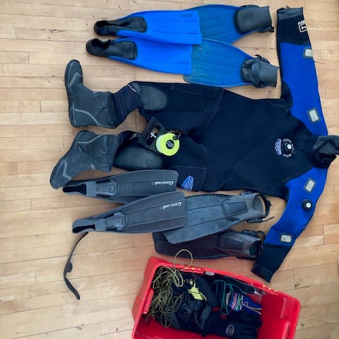 Bare tørdragt str ML, har været brugt af erhvervsdykker, velfungerende incl div. huer handsker og inderdragt 500 kr