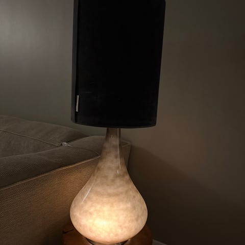 Ny Flavia bordlampe med grå lampefod og lys i foden✨og hvid silkeskærm med skruktur np 3195,- fra trendbazaar nu 2300,-
