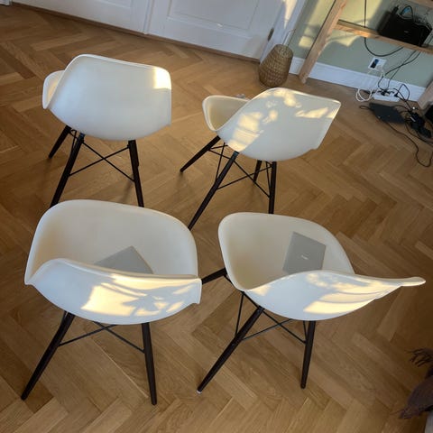 6 stk eames stole sælges. De er brugt, men i pæn stand. Der er brugsspor. Der medfølger måtter til hver stol. En af dem er en smule i stykker, men de medfølger gratis.