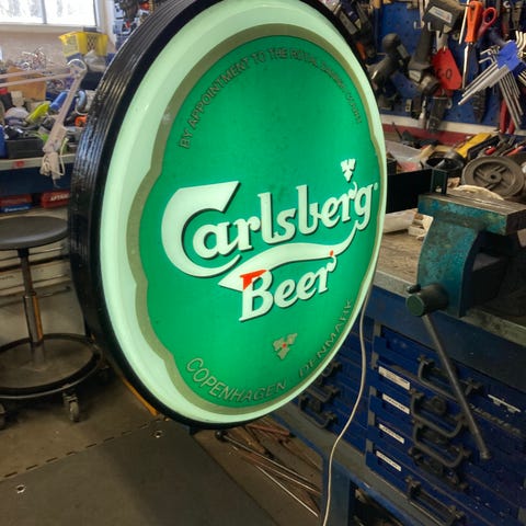 Autentisk Coca-Cola kiosk reklameskilt fra 1980'erne, i rød og hvid farve med Coca-Cola logo og tekst. Skiltet har en rektangulær form og er designet til indendørs brug som dekorativt element eller reklame. Dansk produktion