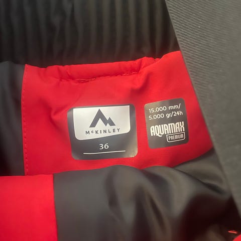 Colmar skijakke og skibukser i grå og beige farver. Jakken har hætte og lynlåslommer foran. Bukserne har forstærkede områder ved benene og justerbar talje. Sættet er designet til vinterbrug og skiløb.