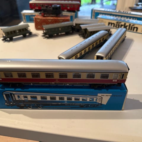 Märklin 4037 modeltogsvogn i metal med sølvfarvet tag og grønne sider. Passer til modeltogbaner og samlinger.