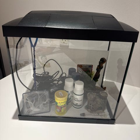 Akvarium med sort låg, inklusive en trærod, et lille net. Egnet til opdræt af fisk eller akvatiske dyr. Låget har lys indbygget. L44xB27xH37,5 cm