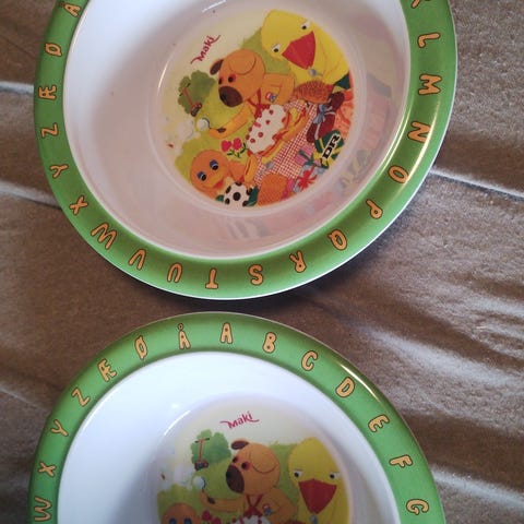 Store tallerkner fra Rice. Den ene i rosa farver med hvide svaner og den anden i lilla med multifarvede høns. Nærmest ikke brugt, da vi primært har brugt nummeret mindre.