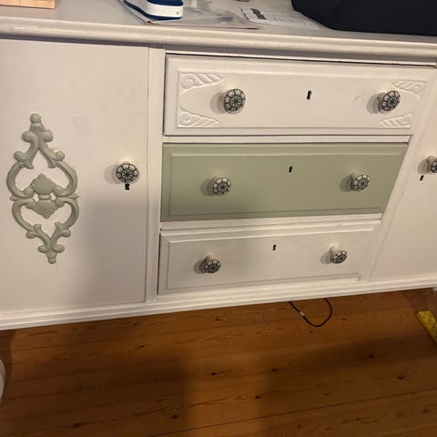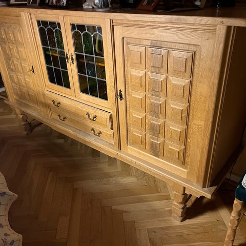 Rummelig skænk med 5 store skuffer og 2 skabe. Hængevitrine med 2 glaslåger og åben reol i midten. I sort ask-finer.