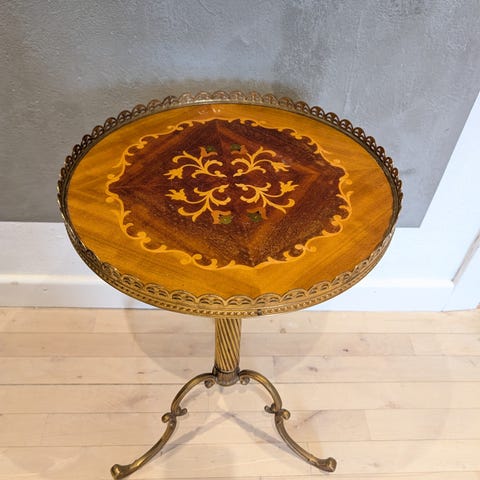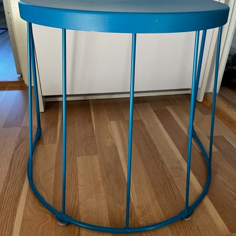 Sidebord i metal med rund bordplade og fire ben. Bordet har en enkel og funktionel konstruktion, velegnet til indendørs eller udendørs brug som et lille bord til opbevaring eller dekoration.
