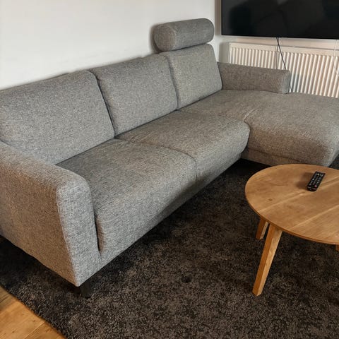 Rigtig god sofa med stålben. Dybde 148 cm ved chaiselong, benhøjde 44 cm