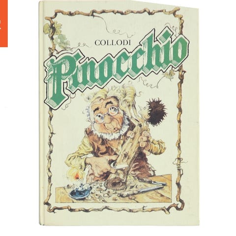 Pinocchio børnebog med illustreret omslag. Indeholder historien om Pinocchio, en klassisk fortælling for børn. Bogens omslag viser en tegning af Pinocchio i farver. Bogens størrelse og materiale er ikke angivet.