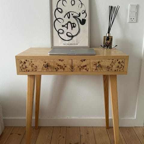 Antikt sminkebord der også kan anvendes som skrivebord fra Normina møbelsnedkeri. Buret har to mindre skuffer samt en større i højre side som åbnes via messinghåndtag. Originale tegninger af møblet der er rammet ind hos glarmestre medfølger.
