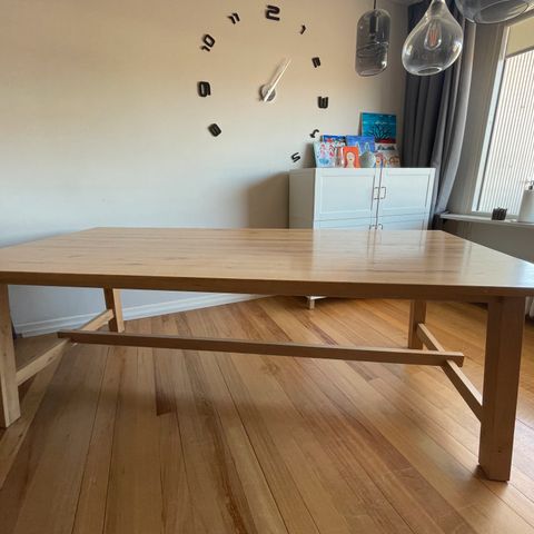 Massivt træbord i god, kraftig kvalitet. Bordet har et enkelt og tidløst udtryk og egner sig perfekt som stort spisebord, mødebord eller arbejdsbord.