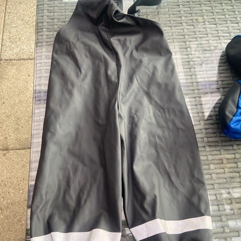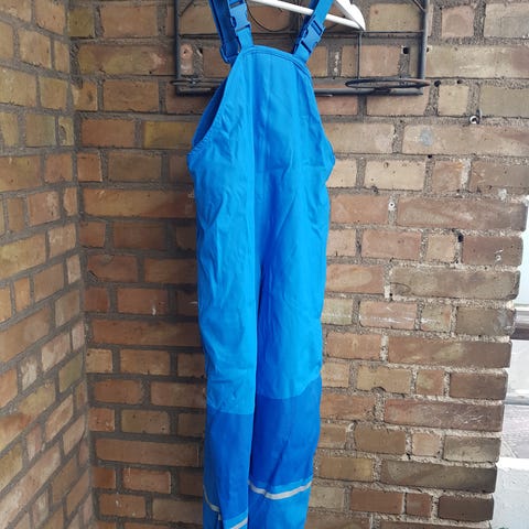 Regnbuks str 128 "M-V-S ,sort, med for og amerikansk lukning ved ankler så det er lettere at få på, 2 sidelommer og 1 baglomme alle med amerikansk lukning, som nye kun brugt 1 gang