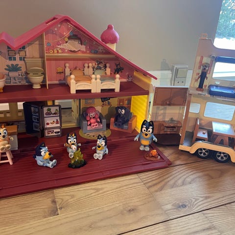 Bluey legetøjshus med tilbehør, herunder figurer og rekvisitter som skateboard, redningskrans, og diverse småting. Legetøjet er designet til børn og kan bruges til rolleleg og kreativ leg.