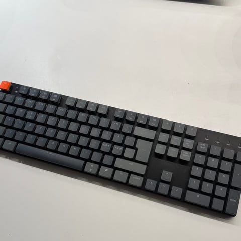 Keychron M5 i hvid farve. Designet til at reducere håndledsbelastning med en vertikal grebsposition. Trådløs forbindelse og flere knapper til funktionel brug.