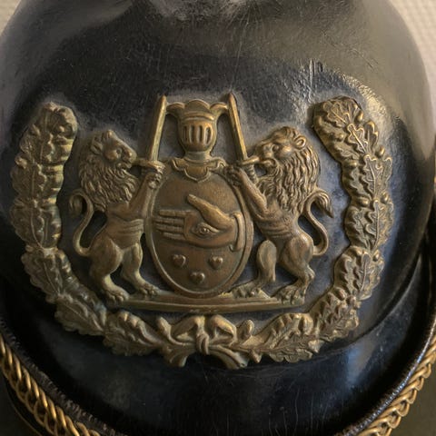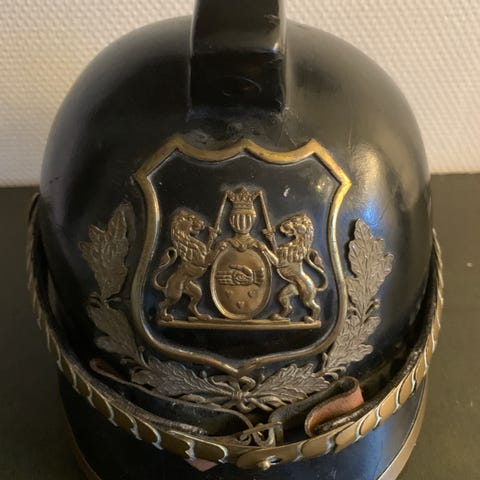 Antik Politi hjelm - patineret brugt stand -/ kig fotos - sælges fra samling som skal videre.