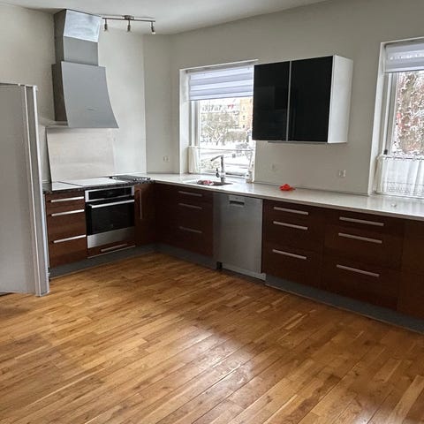 Køkken med mørke træfronter og integrerede hvidevarer, herunder ovn og køleskab i rustfrit stål og opvaskemaskine som er 2 år gammel medfølger. Køkkenet har en U-formet opbygning med flere skabe og skuffer til opbevaring.