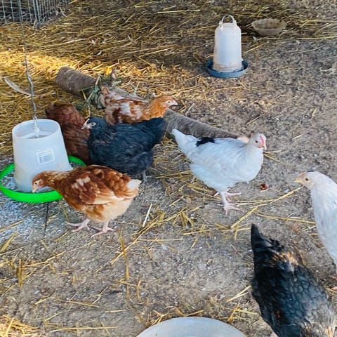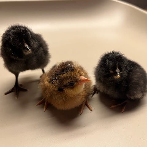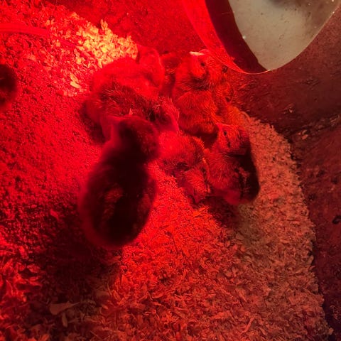12 daggamle kyllinger udklækket 31.12.25. Der 5 Lys Sussex, 6 Australorps og 1 Bielefelder.