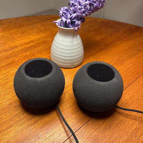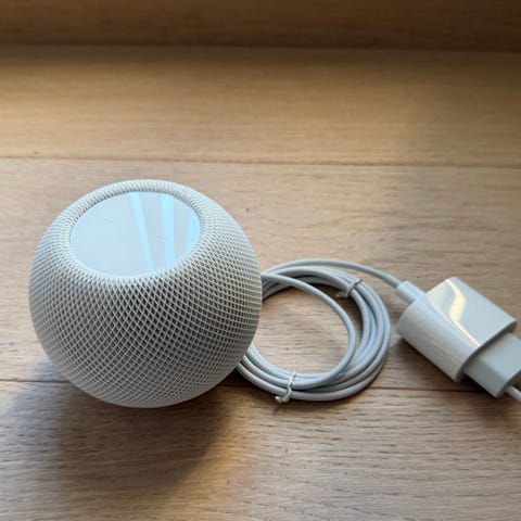 Apple HomePod Mini smart højttaler med rund form og stofbetræk. Designet til at levere lyd af høj kvalitet og understøtter stemmekommandoer via Siri.