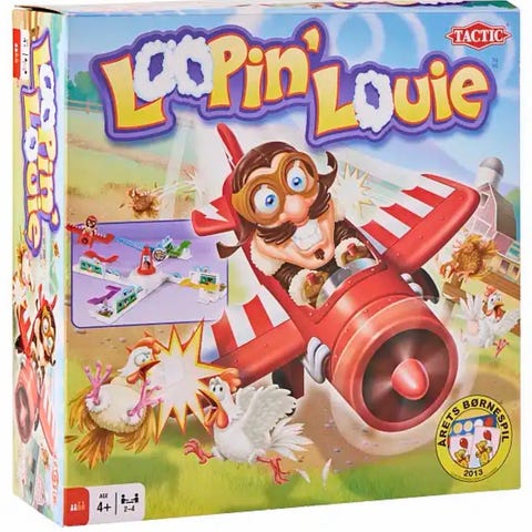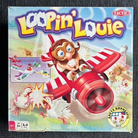 Tactic Loo Pin' Louie brætspil med fly-tema. Spillet indeholder forskellige brikker og kort til flere spillere. Egnet til børn til social og underholdende leg.