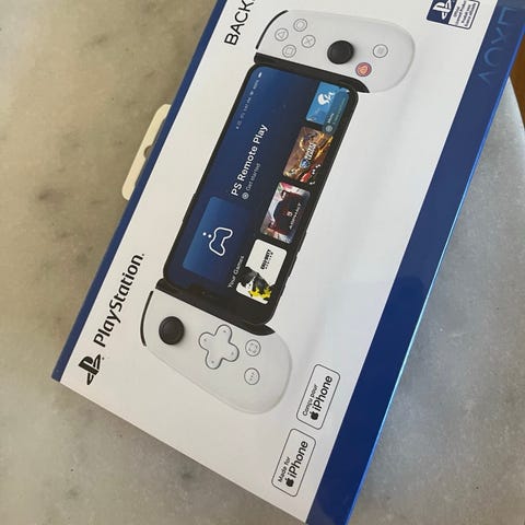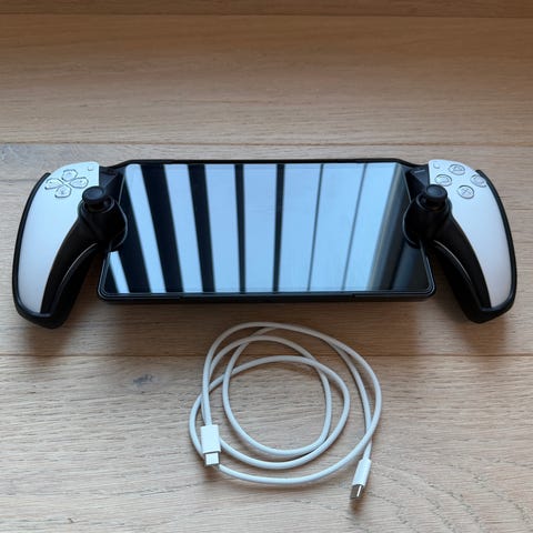 Sony PlayStation Portal håndholdt spillekonsol i hvid farve. Enheden er designet til at give adgang til PlayStation-spil via streaming. Konsollen har en skærm og integrerede controllere, der ligner traditionelle PlayStation-controllere. Velegnet til PlayStation-brugere, der ønsker en mobil spiloplevelse.