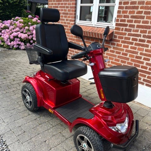 Shoprider Senior 4-hjulet el-scooter i rød farve. Scooter har komfortabelt sæde med rygstøtte og nakkestøtte, kurv foran til opbevaring, spejle og instrumentpanel med kontrolknapper. Designet til voksne brugere til mobilitet og transport. Kørt omkring max 1000 km og altid stået indenfor. er fra 2020.