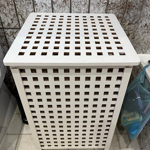 Flot vasketøjskurv i massivt træ med udtagelig stofpose.