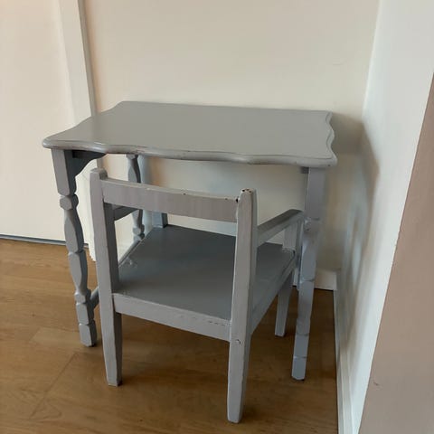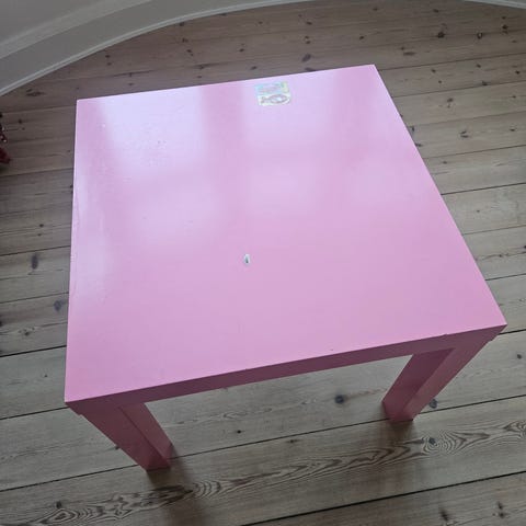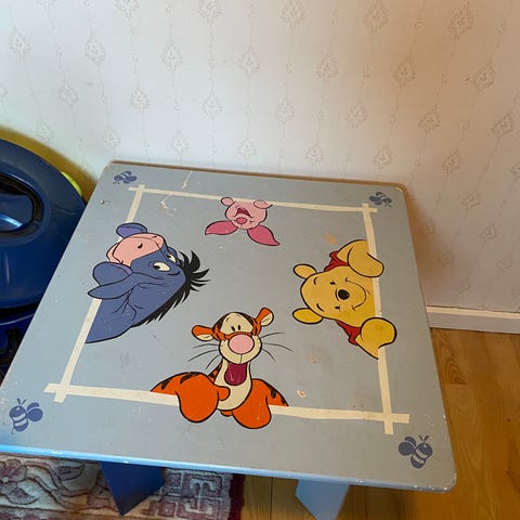 Børnebord, blåt med motiv af Peter Plys og vennerne. 60 x 60 cm højde 40 cm. Mindre brugsspor. Fra røgfrit hjem. Afhentes i Nærum. (H)()(26)