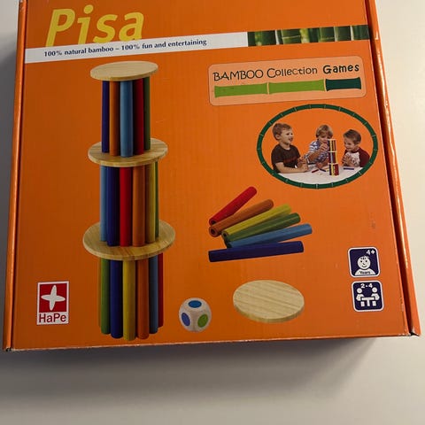 Bambus spil sæt indeholdende flere spildele, herunder terninger og spillebræt. Materialet er bambus, og sættet inkluderer forskellige spillebrikker og instruktioner. Velegnet til forskellige brætspil og familiespil.