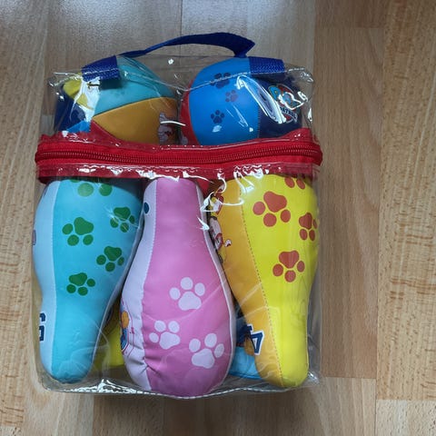 Paw patrol bowling sæt, med 6 kegler og 1 kugle.