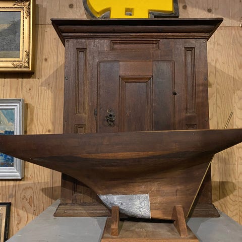 Modelbåd lavet i træ med detaljerede sejl. Båden er monteret på en stander, hvilket gør den velegnet til dekoration eller samling. Designet viser en klassisk sejlbåd med fokus på realistiske detaljer. Købt hos careofcarl.dk til ca. 2.500 kr.